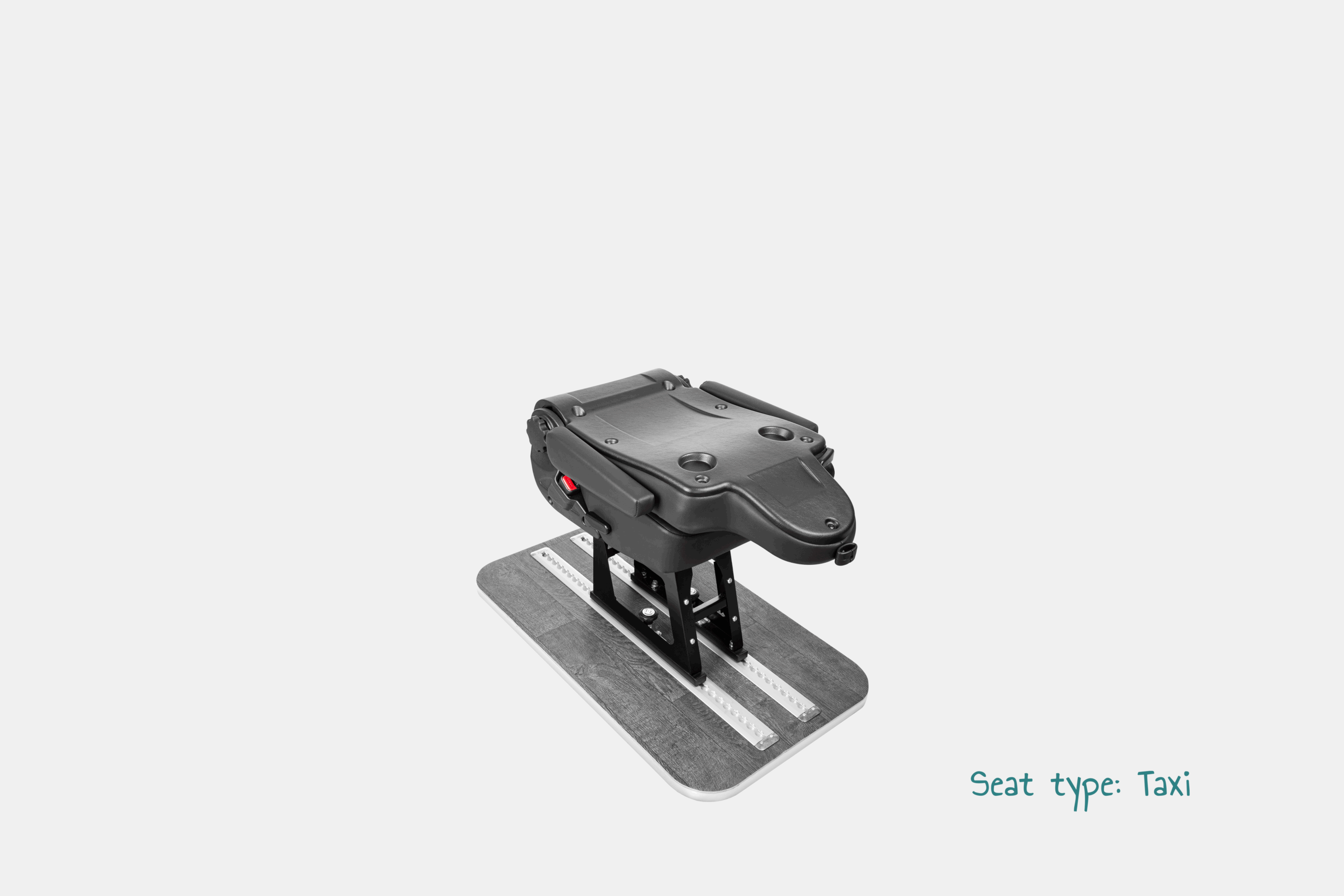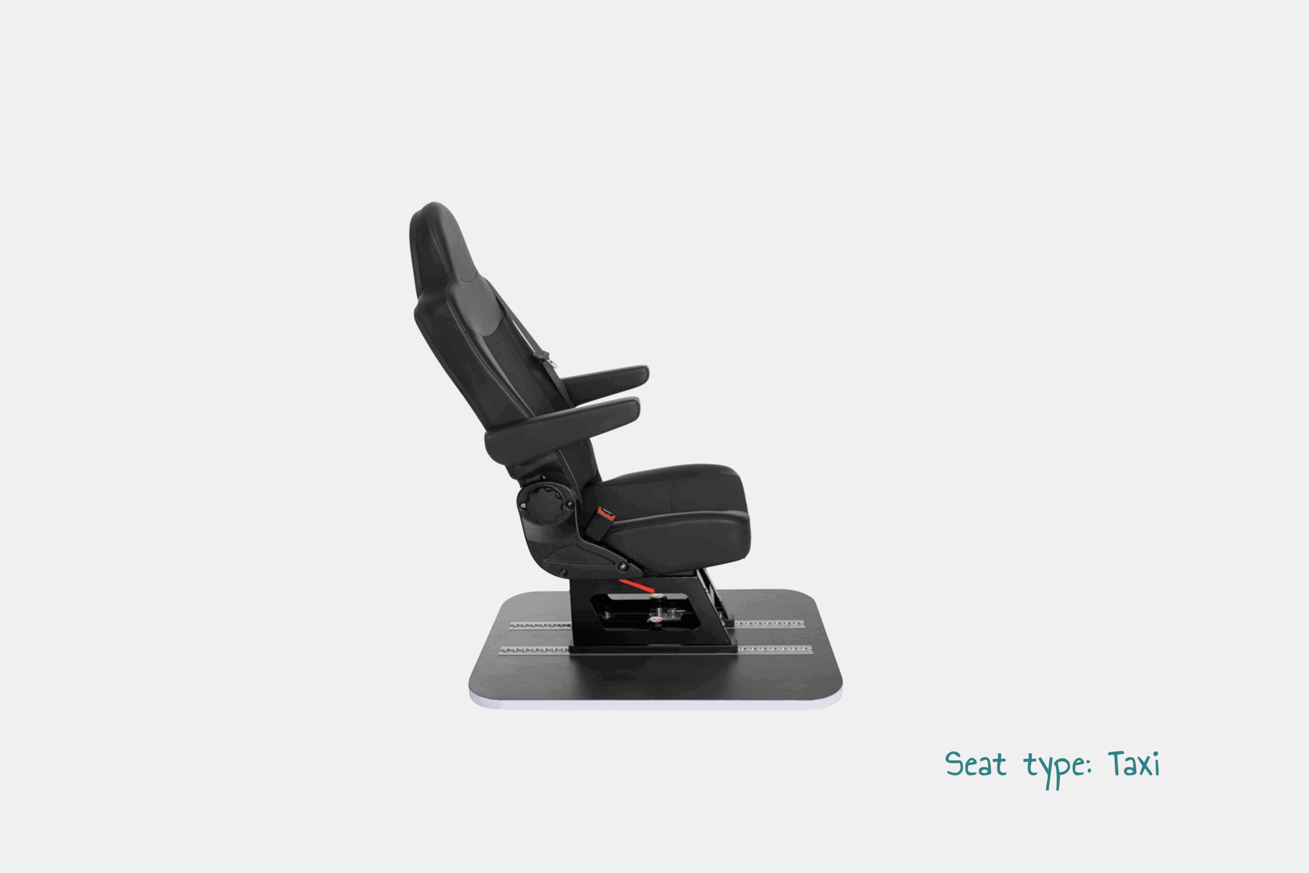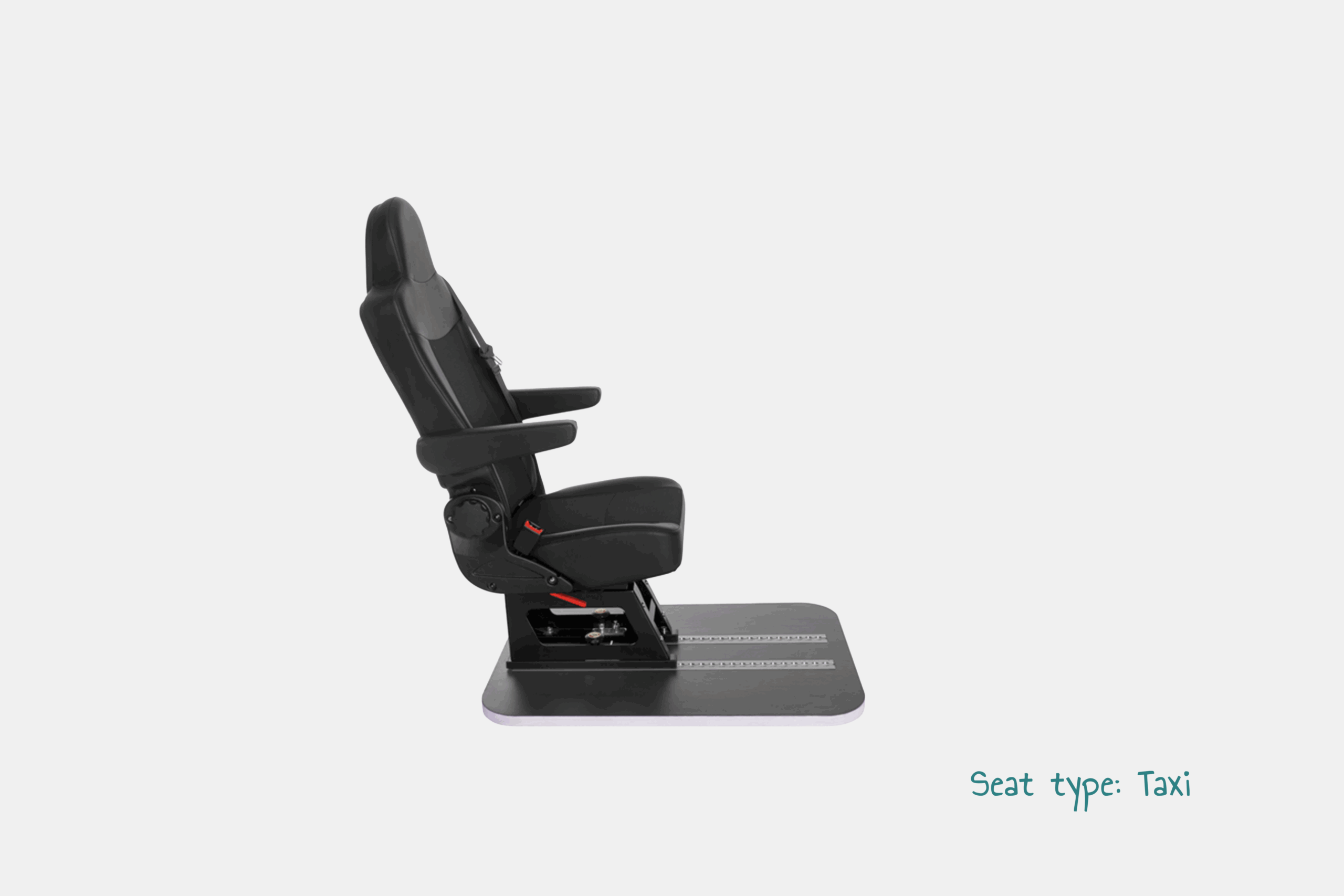 - Taxi: The lightest and narrowest seat in the range. Extremely space‑saving, featuring a reclining backrest that folds fully forward.